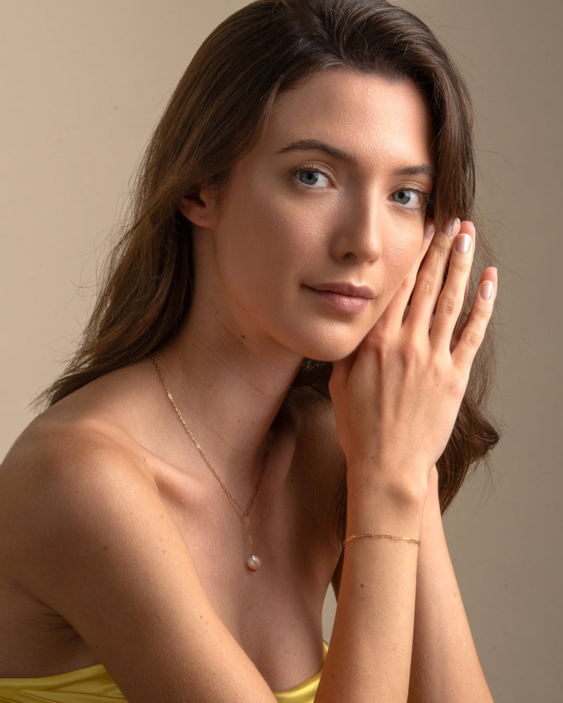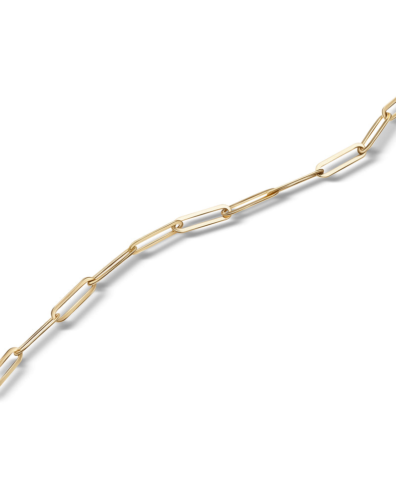 Dieses raffinierte Armband besteht aus einer fein gearbeiteten Goldkette mit einem glatten, polierten Finish. Sein schlichtes und doch elegantes Design macht es zu einem vielseitig einsetzbaren Stück.