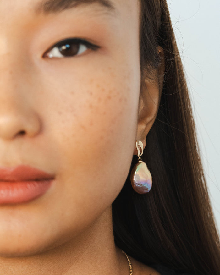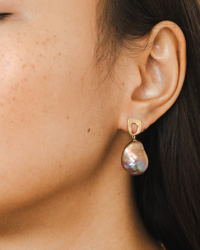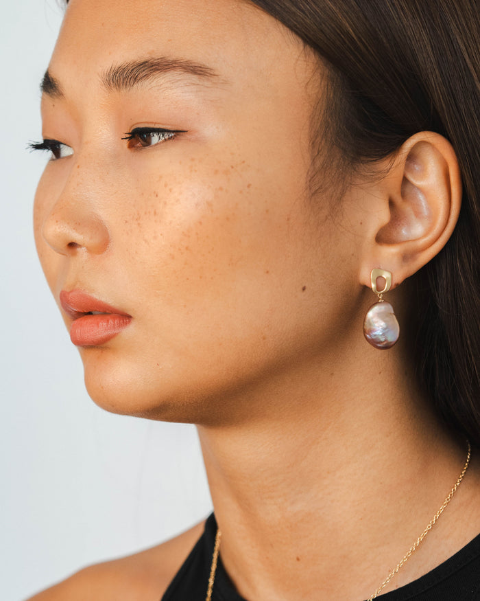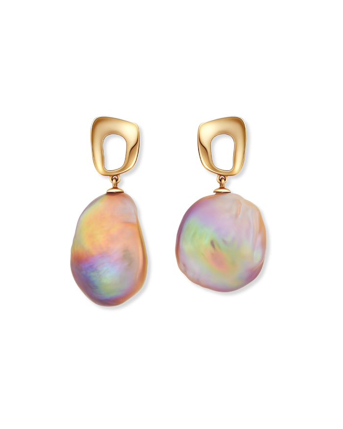 Klobige Quadrate aus 18 Karat Gold sind eine mutige Wahl, versüßt durch Perlen in Korallenfarbe in einem Paar Ohrringe, nach denen sich die Leute umdrehen werden.