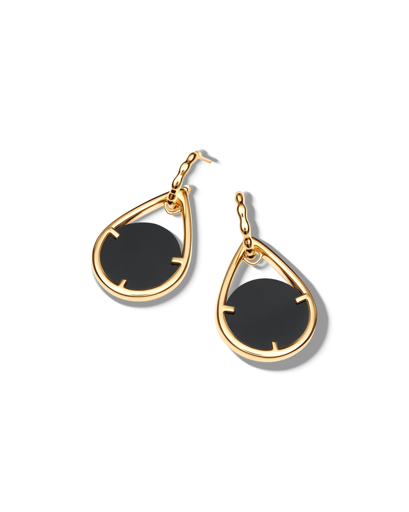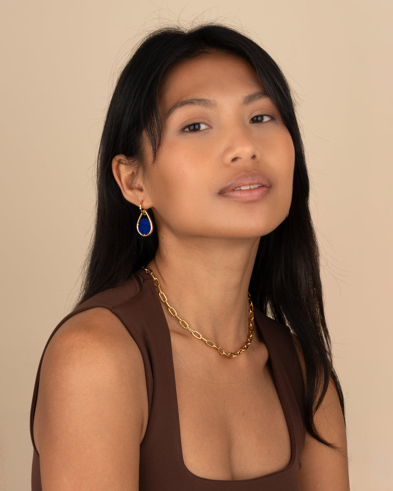 Ein goldener Ring hält anmutig einen fein gearbeiteten Tropfenumriss und umrahmt darin eine bezaubernde blaue runde Platte. Das innovative Muster der Ringe und das kostbare Gold, aus dem das Stück besteht, ergeben eine atemberaubende Kombination aus leuchtender Farbe und zeitlosem Stil.