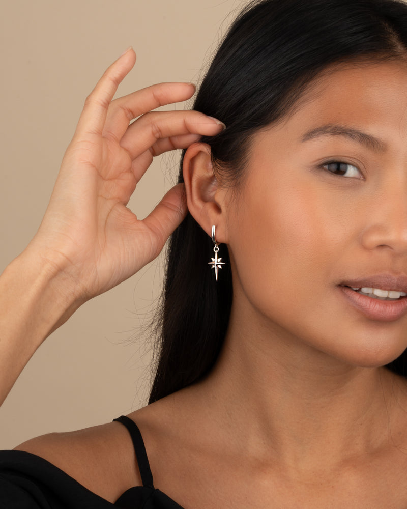 Damit Sie nie die Orientierung verlieren, erfinden diese Ohrringe das Motiv der Windrose neu und kombinieren es mit goldenen Creolen.