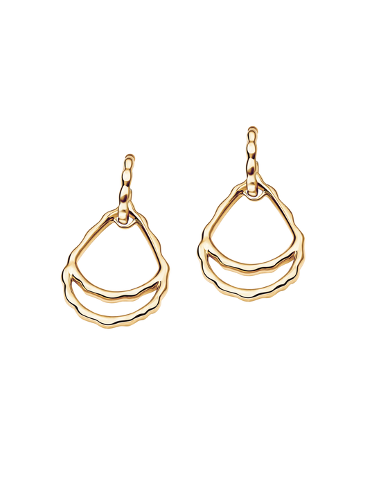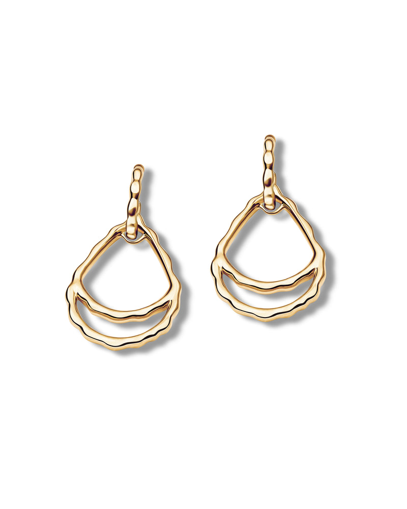 Diese Ohrringe mit ihrem komplizierten und offenen Tropfenumriss zelebrieren die Schönheit des negativen Raums. Eine doppelte Linie an der Basis der Form macht sie zusammen mit dem geriffelten Motiv einzigartig. Die leichten, aber wirkungsvollen Tropfen erzeugen einen ätherischen und raffinierten Effekt und machen sie zum perfekten Accessoire für jeden Anlass.