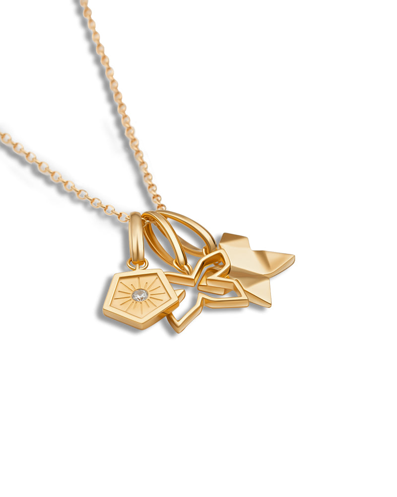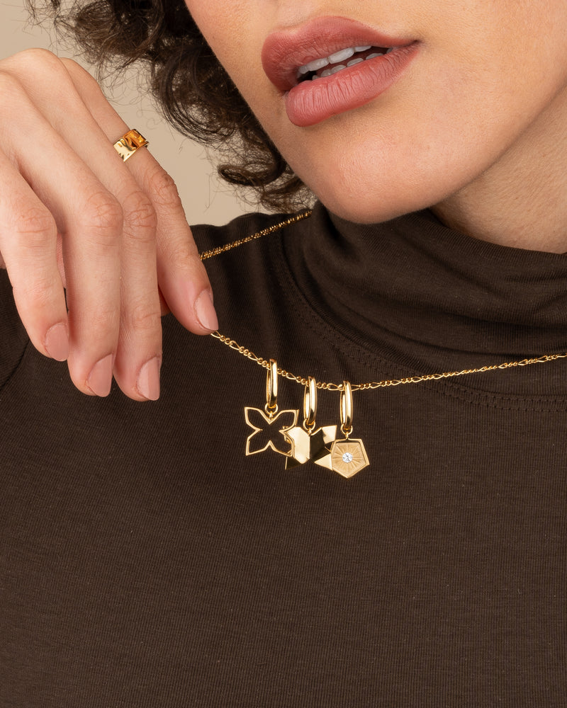 Die elegante Verbindung von Natur und Raffinesse. Zwei anmutige Schmetterlinge schweben sanft neben einem funkelnden Fünfeckanhänger, der mit einem faszinierenden grünen Element verziert ist. Dieses mit Präzision gefertigte harmonische Trio zelebriert die Verbindung von zarter Ästhetik und lebendiger Anziehungskraft.