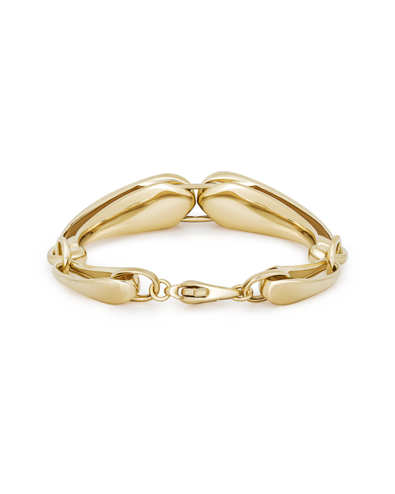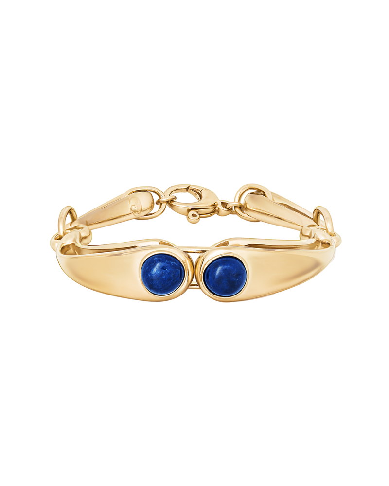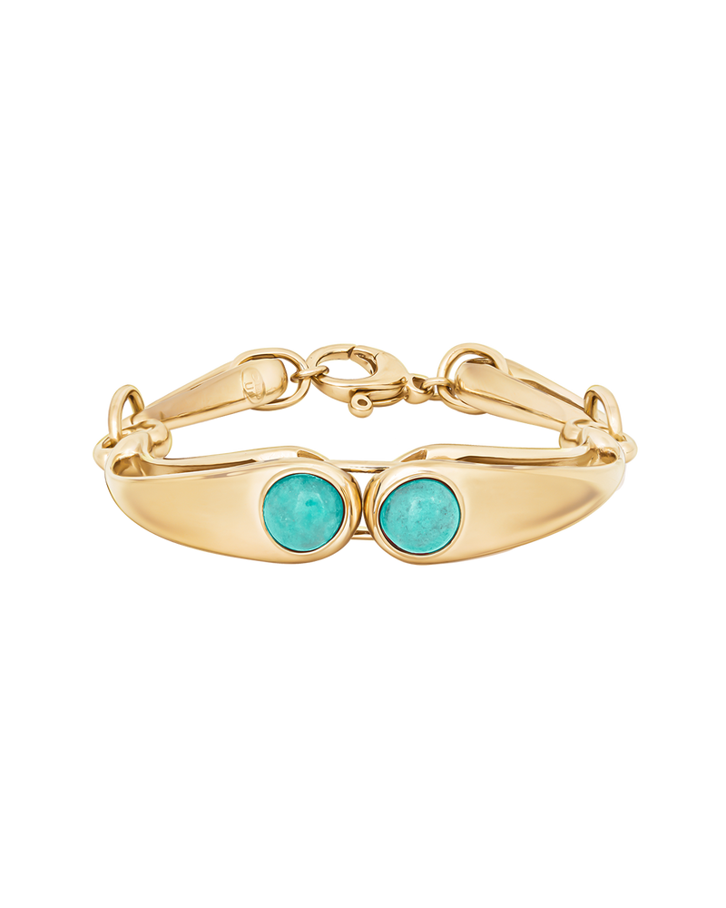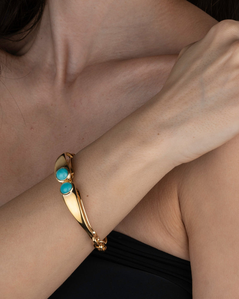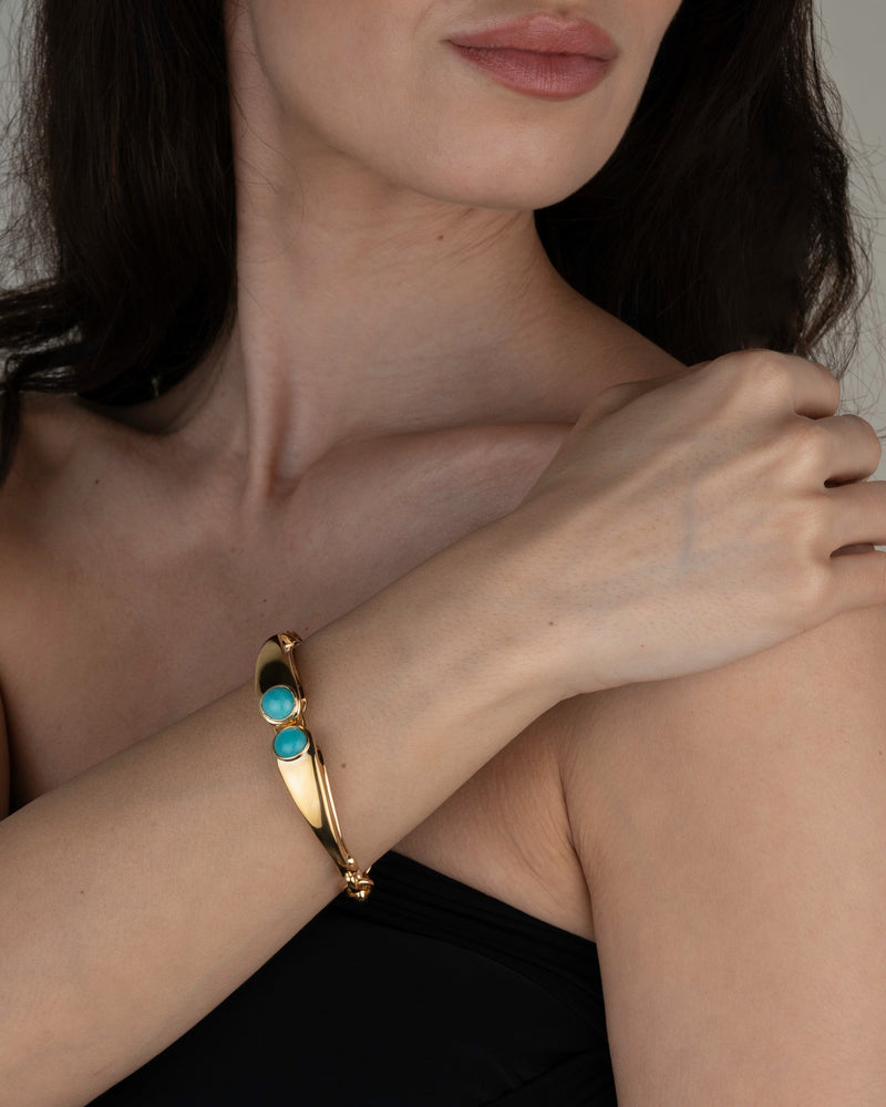 Eine polierte Goldgrundstruktur wird durch die Zugabe von glänzenden Edelsteinen an der Oberseite Ihres Handgelenks vereint. Dieses Armband verfügt über ein modernes Design, das es vielseitig genug macht, um es allein als Statement-Stück zu tragen oder mit anderen Armreifen für einen mehrschichtigeren Look zu kombinieren.