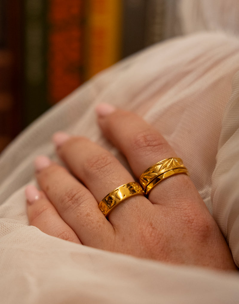 Ein von der Natur inspiriertes Meisterwerk, das die Schönheit organischer Formen feiert. Dieser faszinierende Ring zeigt eingravierte exotische Blätter, die die Essenz natürlicher Eleganz einfangen. Die detaillierten Muster verleihen einen Hauch exotischen Glamours und machen ihn zu einem Statement-Stück für diejenigen, die die harmonische Verbindung von Stil und Natur schätzen.