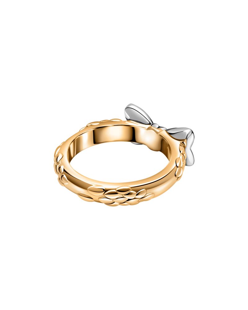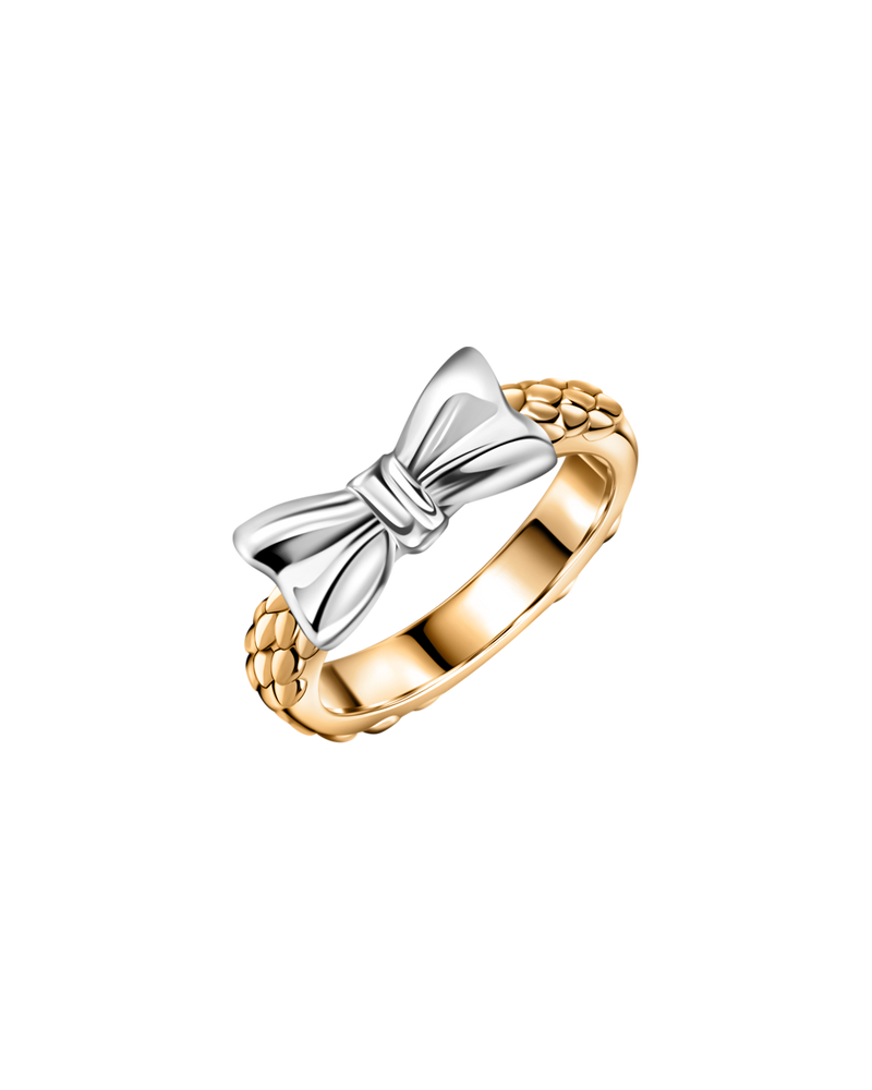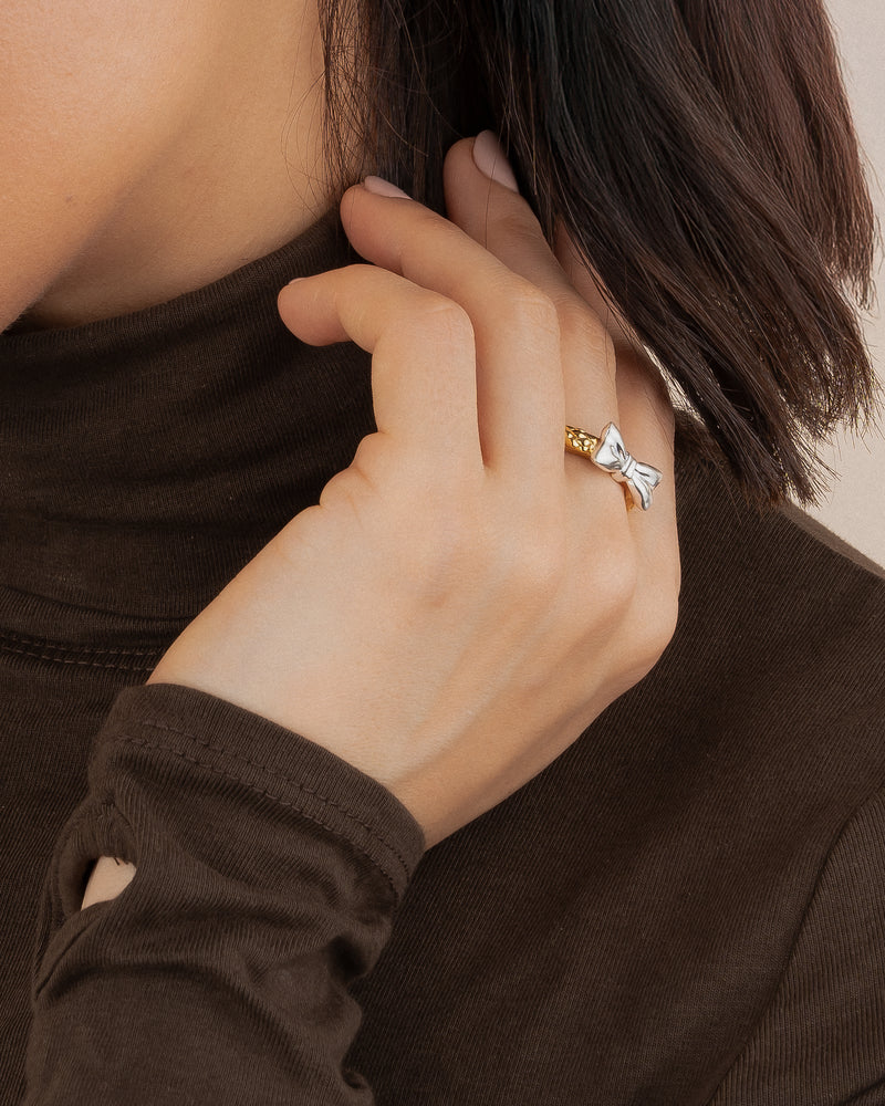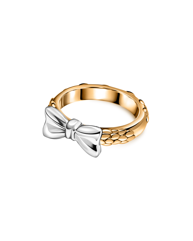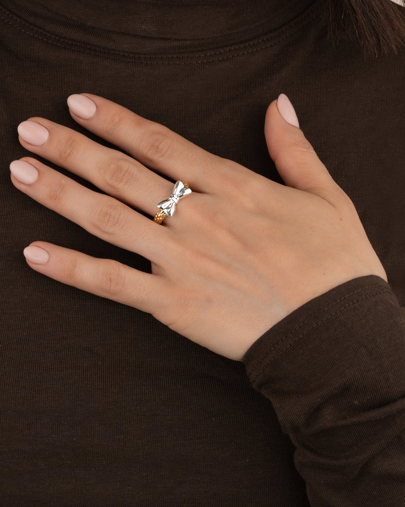 Verschönern Sie Ihre Feiertage mit diesem zarten Schleifenring. Dieses aus strahlendem Gold gefertigte und mit einer zarten silbernen Schleife verzierte Schmuckstück verkörpert den Geist des Schenkens und Feierns.
