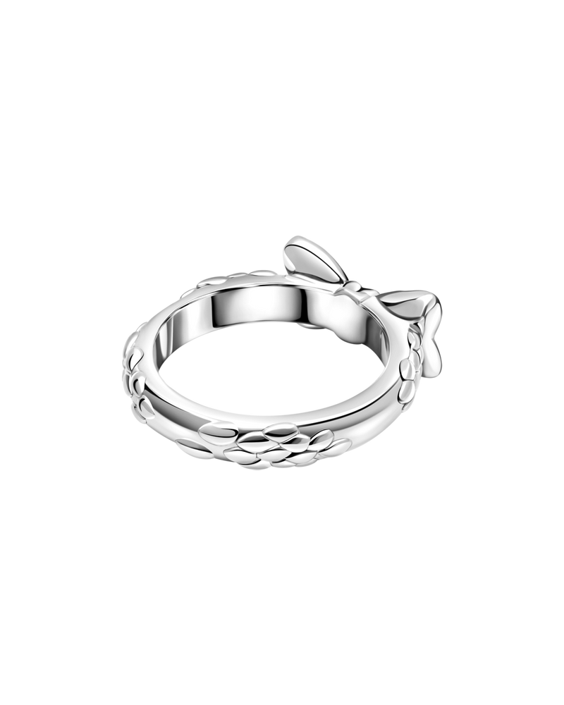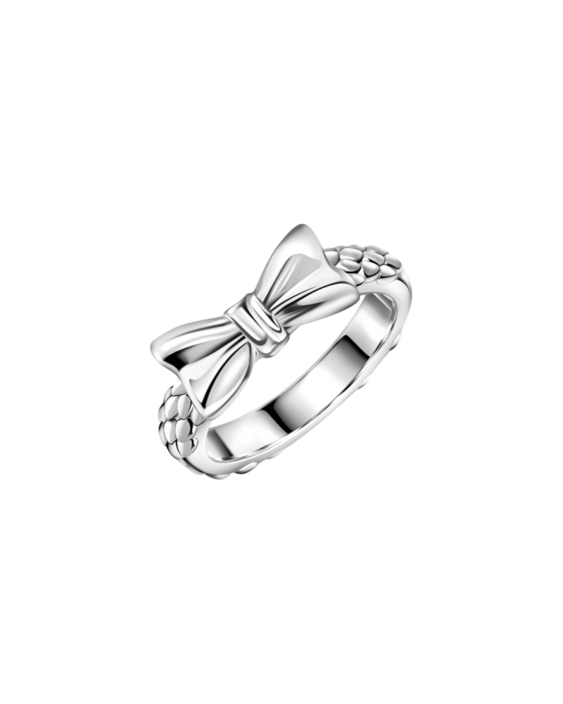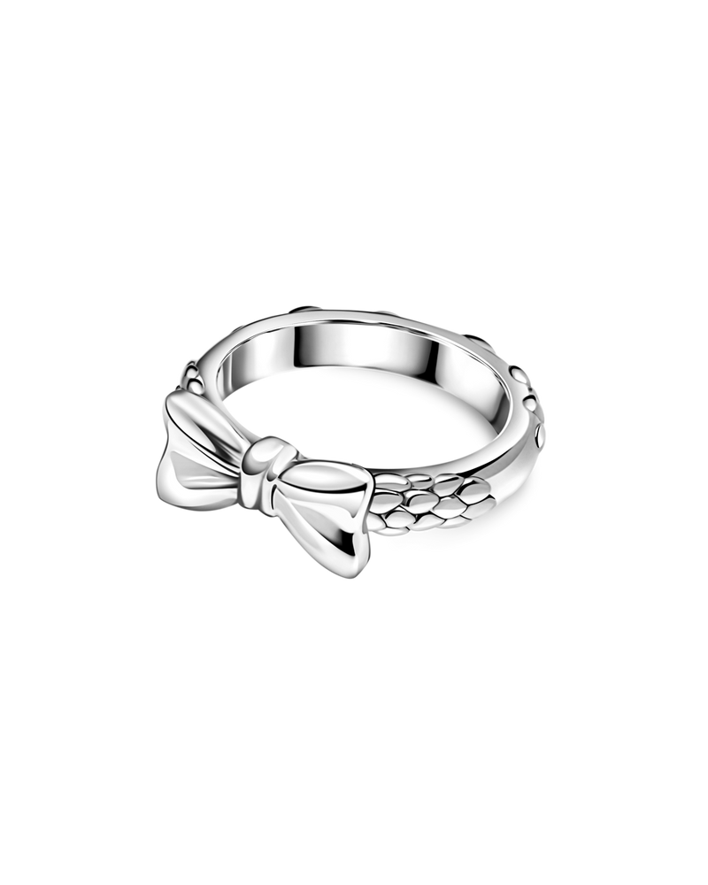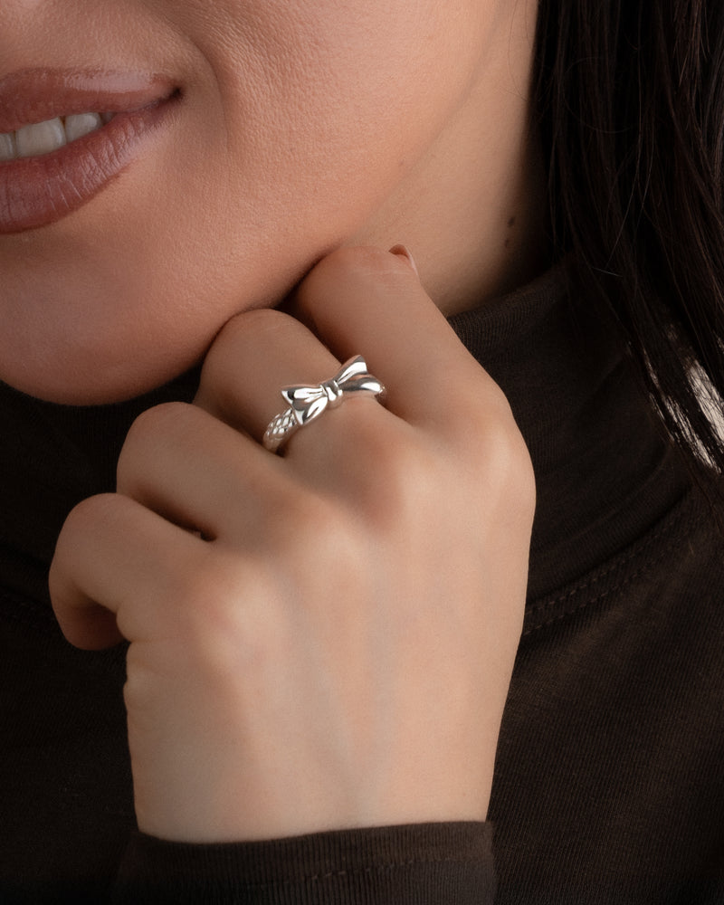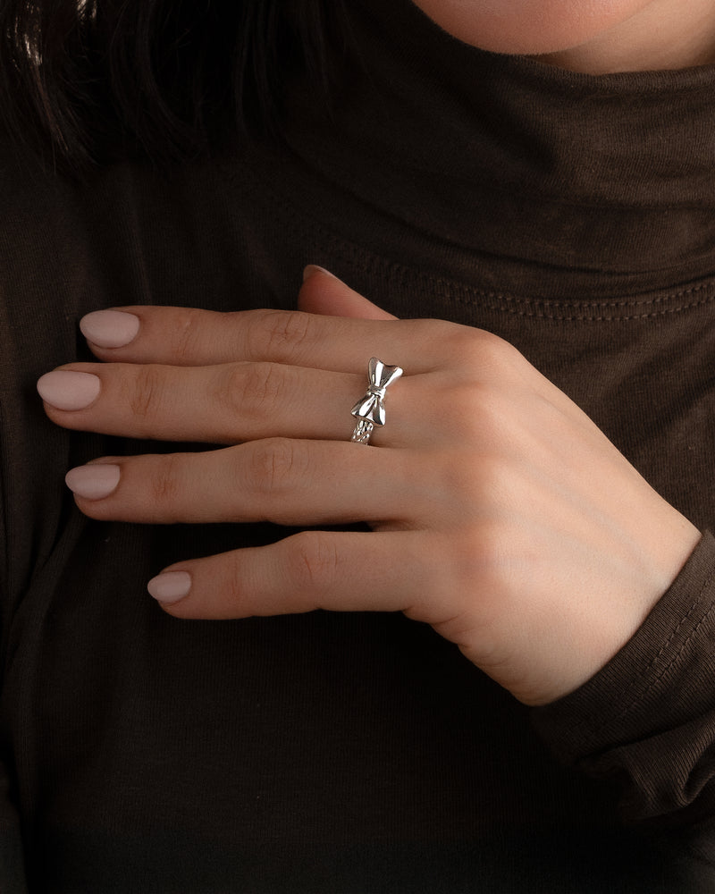 Verschönern Sie Ihre Feiertage mit diesem zarten Schleifenring. Dieses aus strahlendem Gold gefertigte und mit einer zarten silbernen Schleife verzierte Schmuckstück verkörpert den Geist des Schenkens und Feierns.