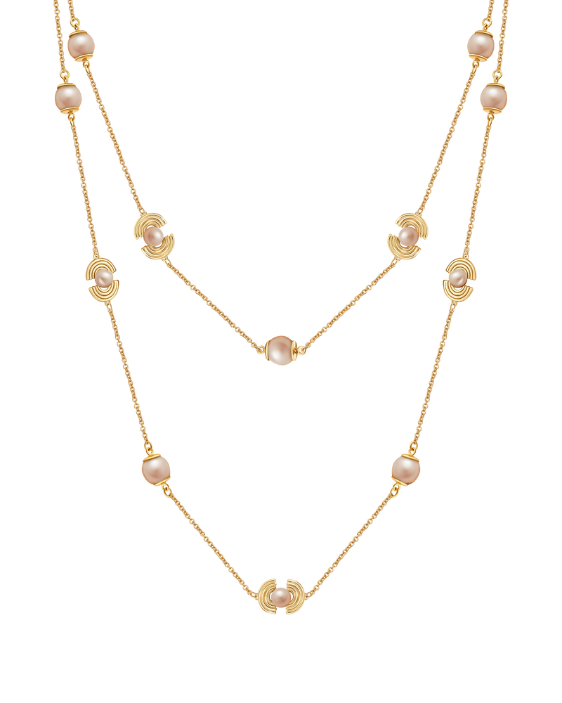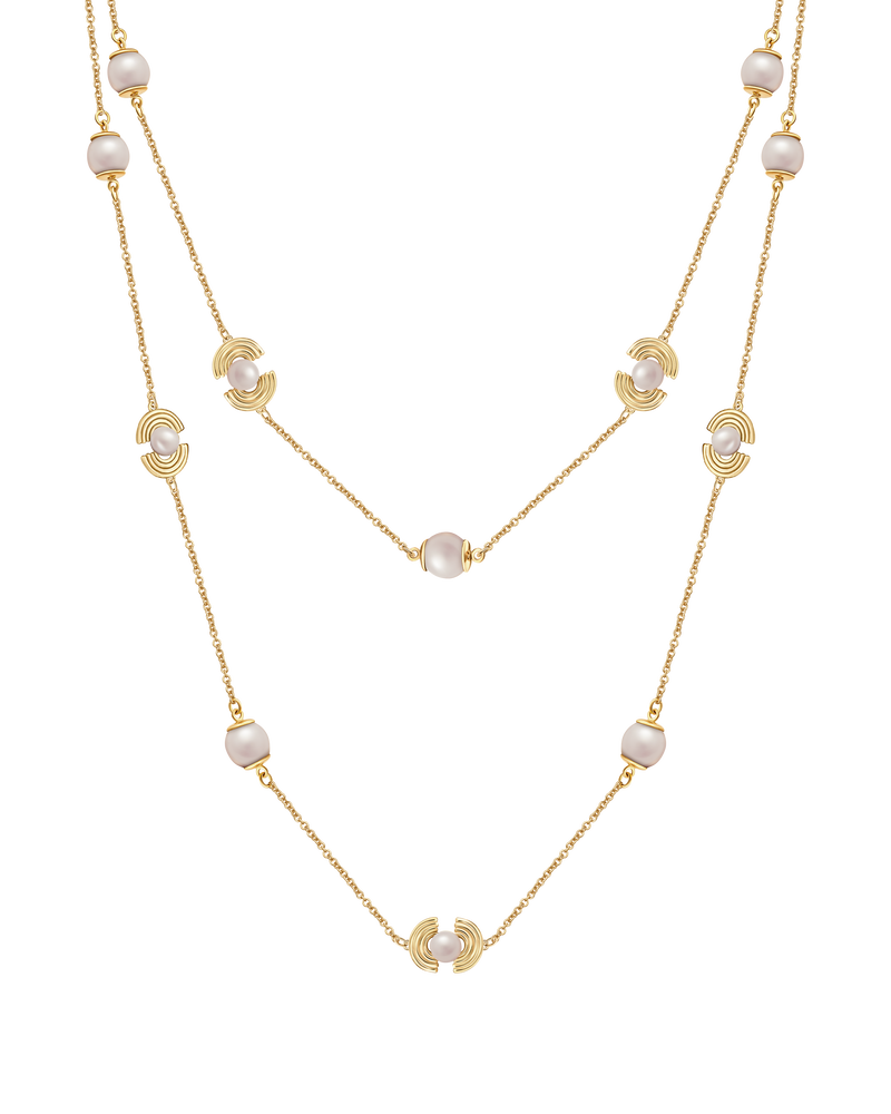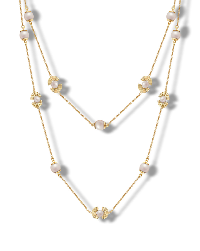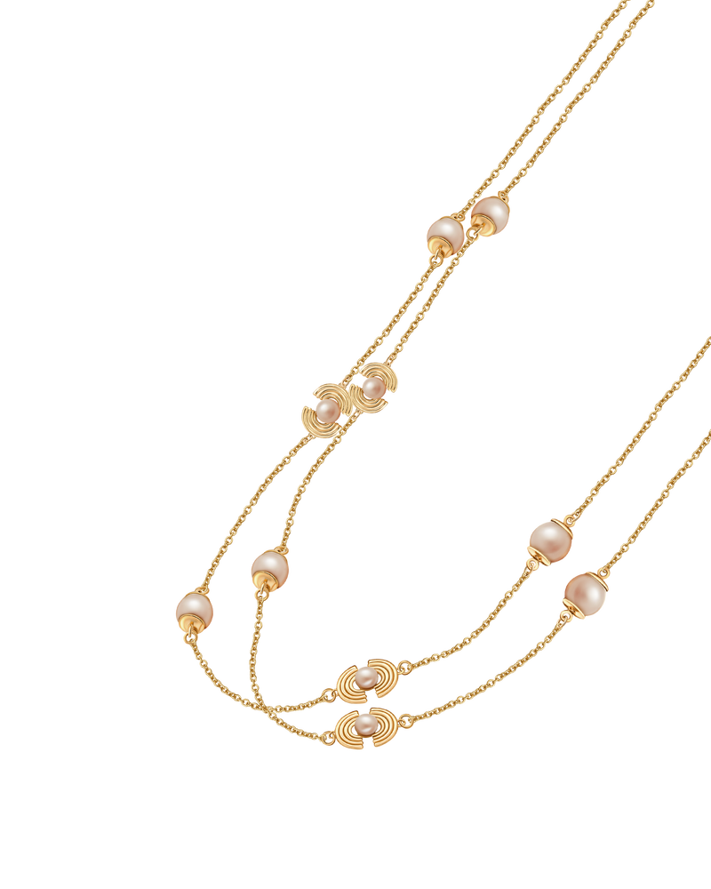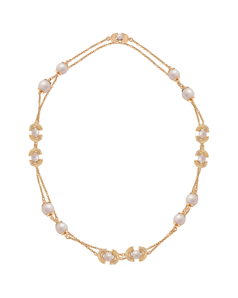 Mit exquisiter Harmonie und zeitloser Eleganz kombiniert diese Halskette opaleszierende Perlen und komplizierte Goldmotive in einem luxuriösen Design. Raffinierte Details machen dieses Stück vielseitig einsetzbar für große Anlässe und zum Protagonisten Ihres Alltagsstils.
