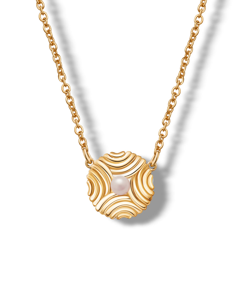 Im Mittelpunkt steht eine glänzende Perle, um die sich zarte goldene Schlangenlinien in einem wunderschönen Anhänger winden. Ein Statement der Raffinesse, das die Schönheit der Einfachheit umarmt.