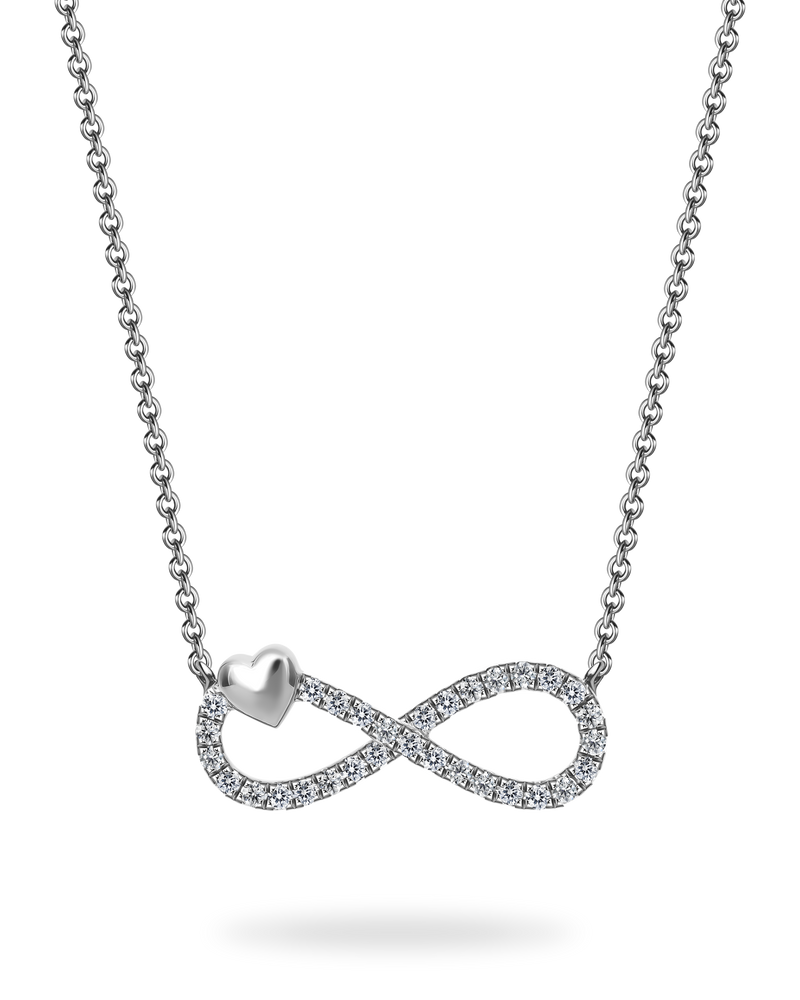 Where the eternal beauty of diamonds meets the timeless symbol of infinity, this necklace symbolises everlasting love and endless possibilities. The addition of a small heart made of fine metal is a unique touch of glamour that makes this piece the perfect gift for commemorating special moments or celebrating infinite love.