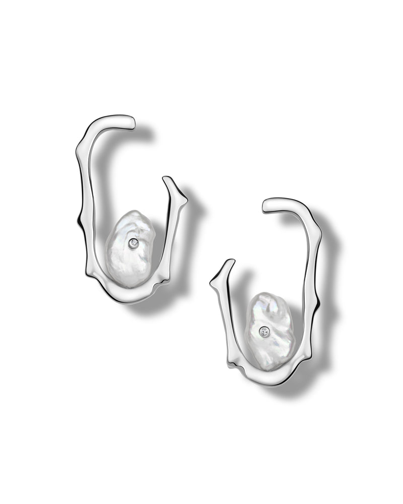 Diese eleganten Ohrringe zeichnen sich durch fließende Silberformen aus, die von Unterwasserkorallen inspiriert sind und mit einer Schicht 3-Mikron-18-Karat-Gold-Vermeil überzogen sind. Sie sind mit Perlen in der Mitte und brillanten Diamanten verziert, die wie Blasen an die Oberfläche steigen.