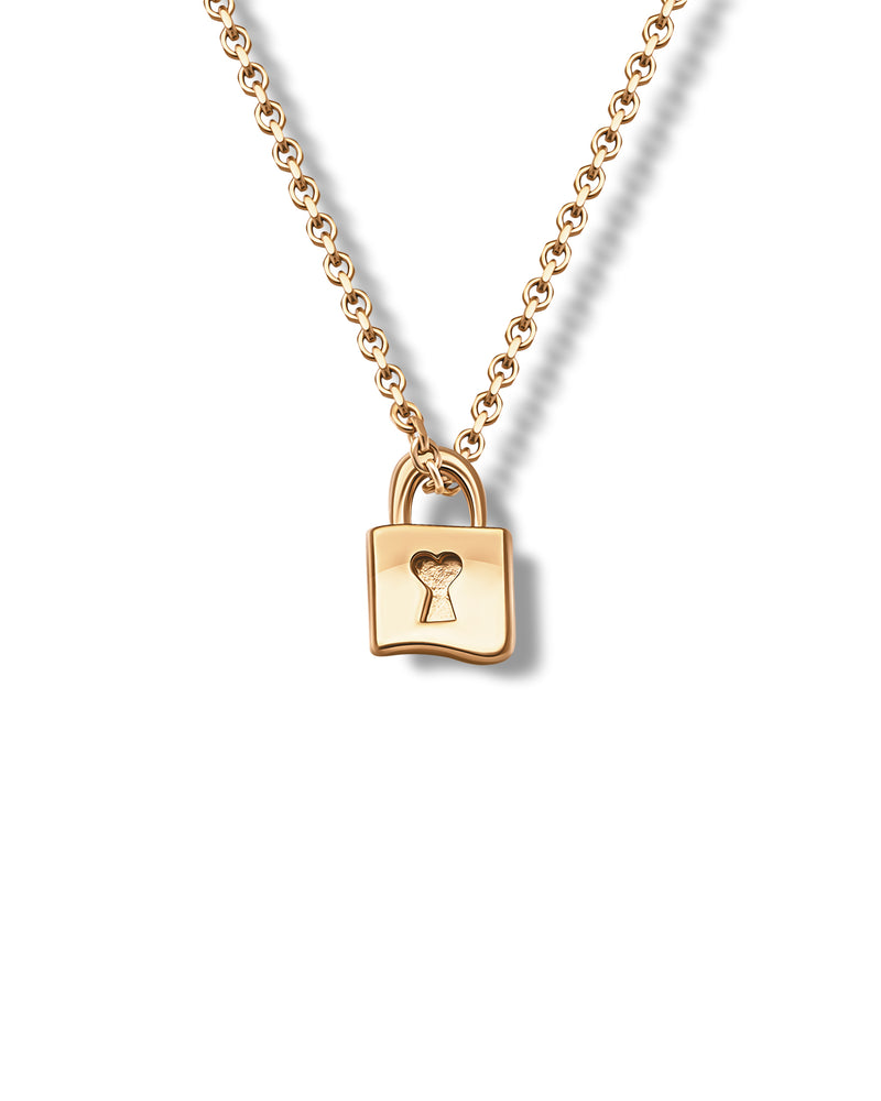 This exquisite gold necklace features a finely crafted lock pendant, symbolizing the treasure of love kept safe. At its center, a delicate engraved heart adds a romantic touch, representing the secret held within — a heart that belongs only to one.