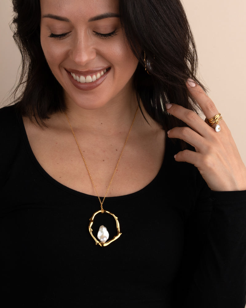 Ein kompliziertes Design aus 3 Mikron starkem 18 Karat Gold-Vermeil-Silber imitiert die Kurven natürlicher Linien innerhalb der Stränge dieses Rings, akzentuiert durch einen schimmernden Diamanten, der an der glänzenden Perle befestigt ist, die das Stück baumeln lässt. Für eine vom Ozean inspirierte Ästhetik.