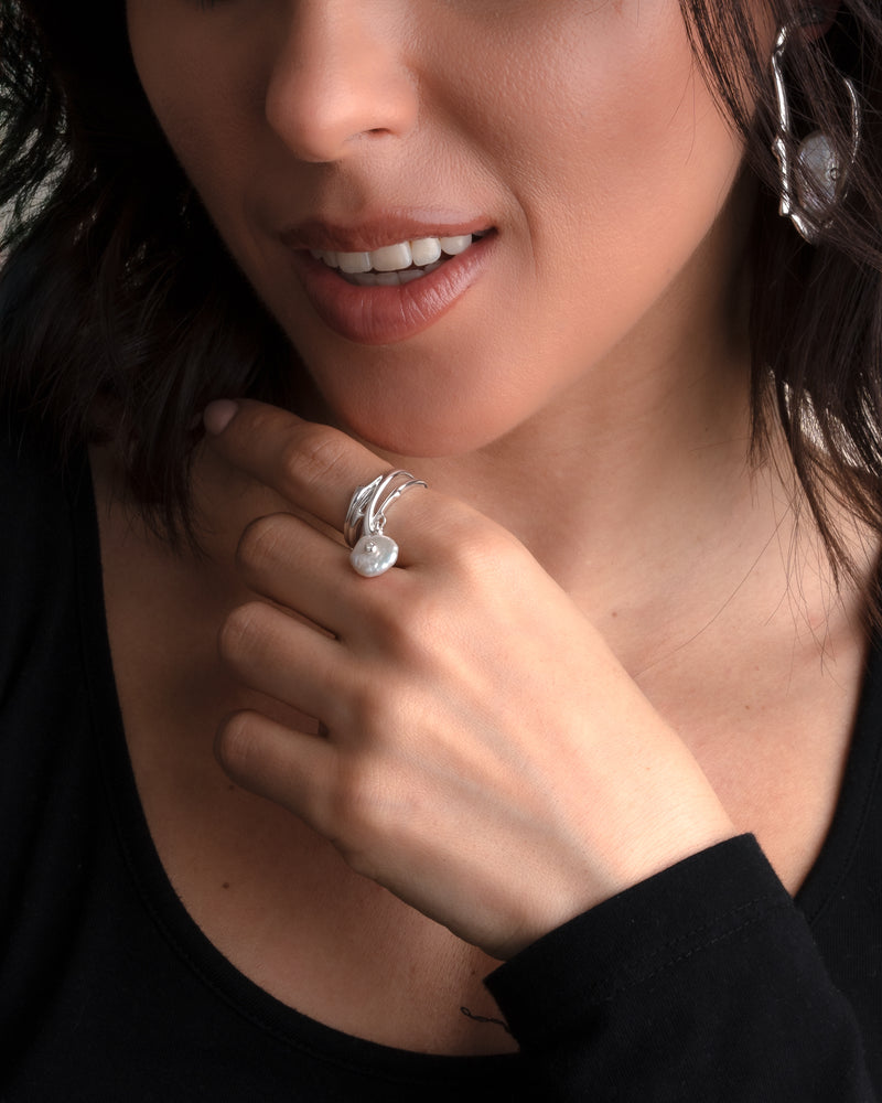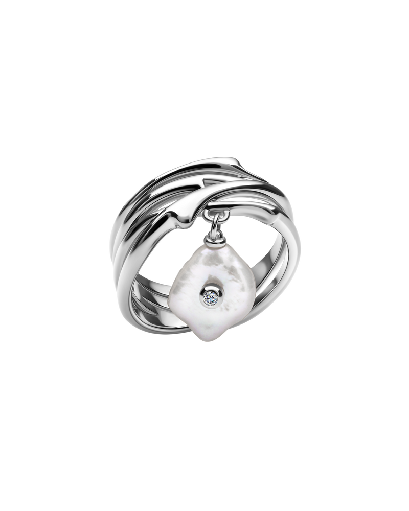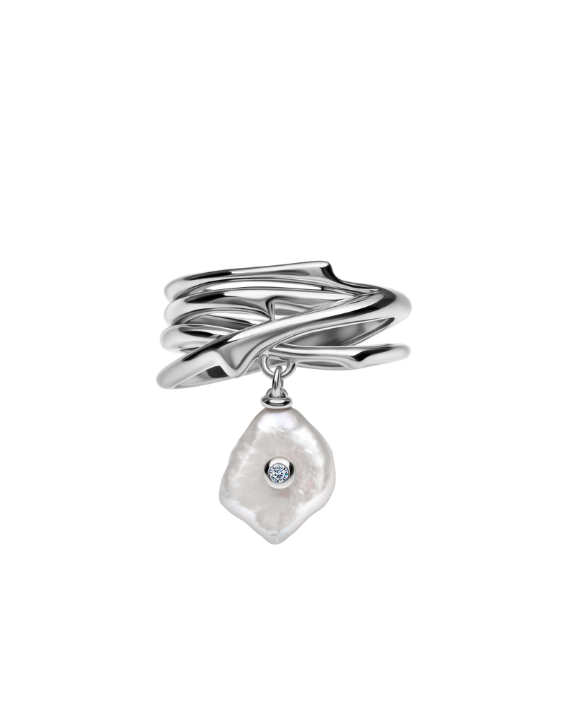 Ein kompliziertes Design aus 3 Mikron starkem 18 Karat Gold-Vermeil-Silber imitiert die Kurven natürlicher Linien innerhalb der Stränge dieses Rings, akzentuiert durch einen schimmernden Diamanten, der an der glänzenden Perle befestigt ist, die das Stück baumeln lässt. Für eine vom Ozean inspirierte Ästhetik.