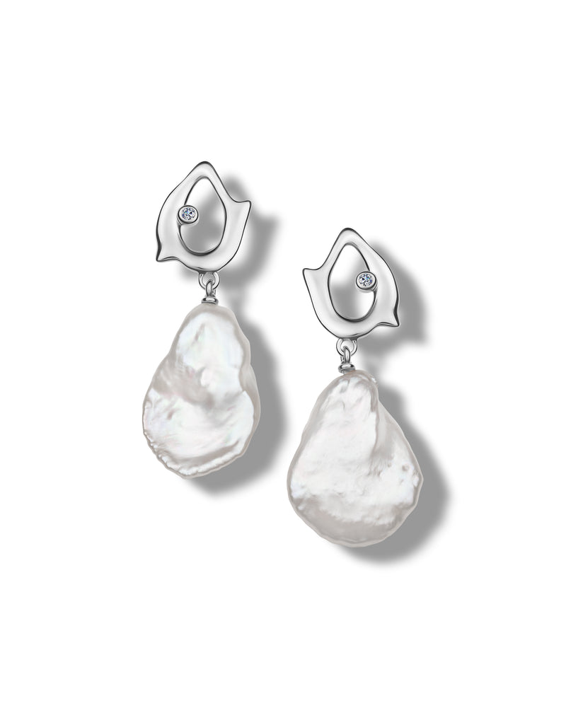 Zarte, vergoldete Spitzenformen bilden die Grundlage dieser eleganten Ohrringe, akzentuiert mit Perlen und Diamanten für einen Look, der sowohl organisch als auch luxuriös ist.