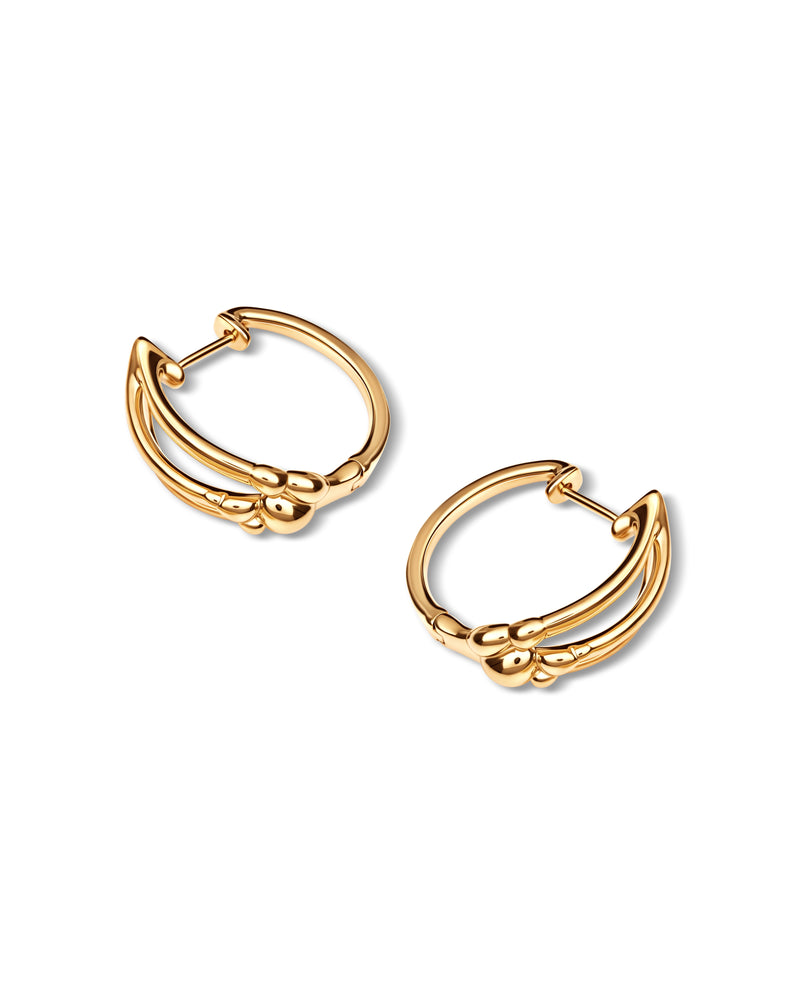 Diese Creolen aus strahlendem Gold sind mit einzigartigen blasenförmigen Verzierungen versehen, die ihnen eine verspielte und moderne Note verleihen. Sie sind mühelos vielseitig und lassen sich nahtlos von lässig zu schick wechseln, was sie zu einem unverzichtbaren Accessoire macht.