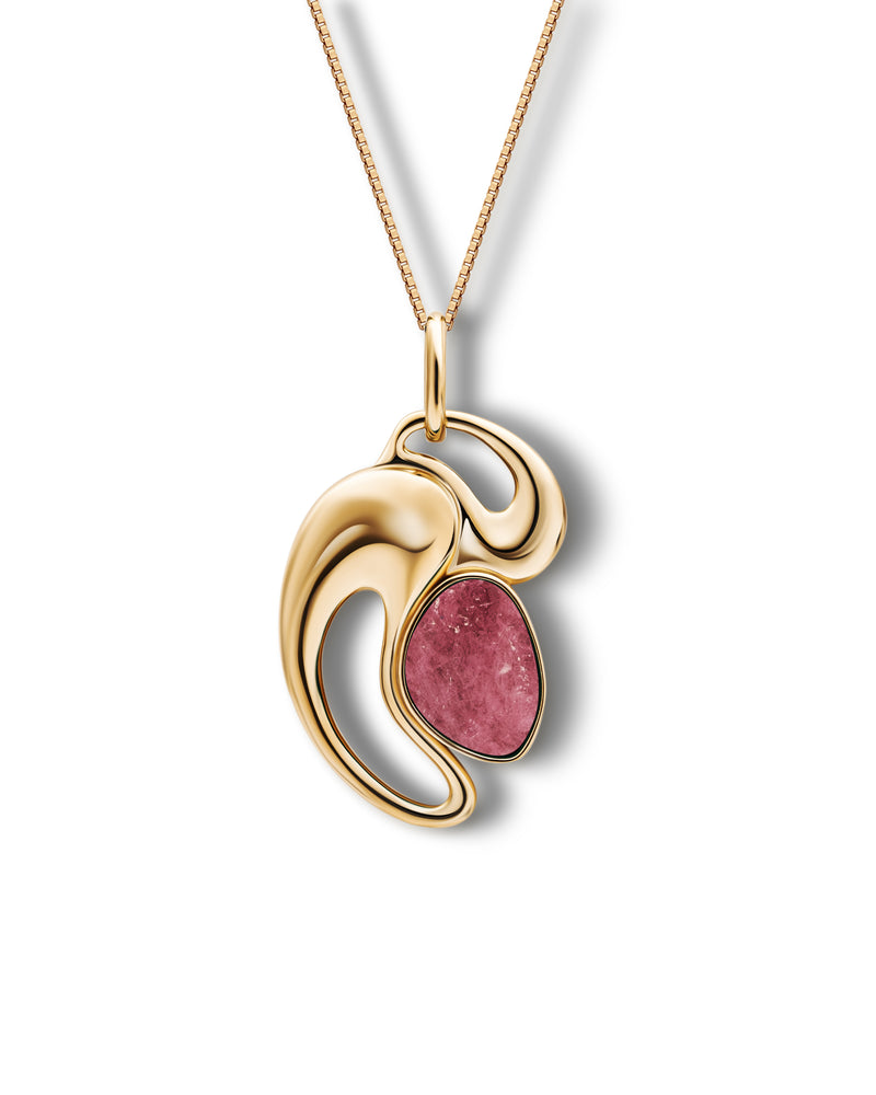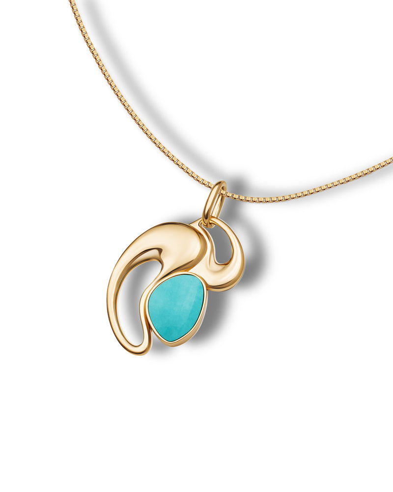 Dieser Anhänger mit einem auffälligen Edelstein fängt dank eines Spiels aus Kurven und Wellen die Essenz der geheimnisvollen Schönheit des Ozeans ein.
