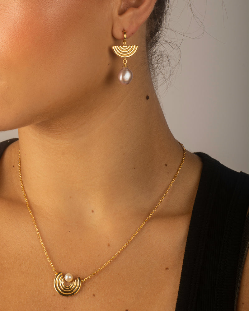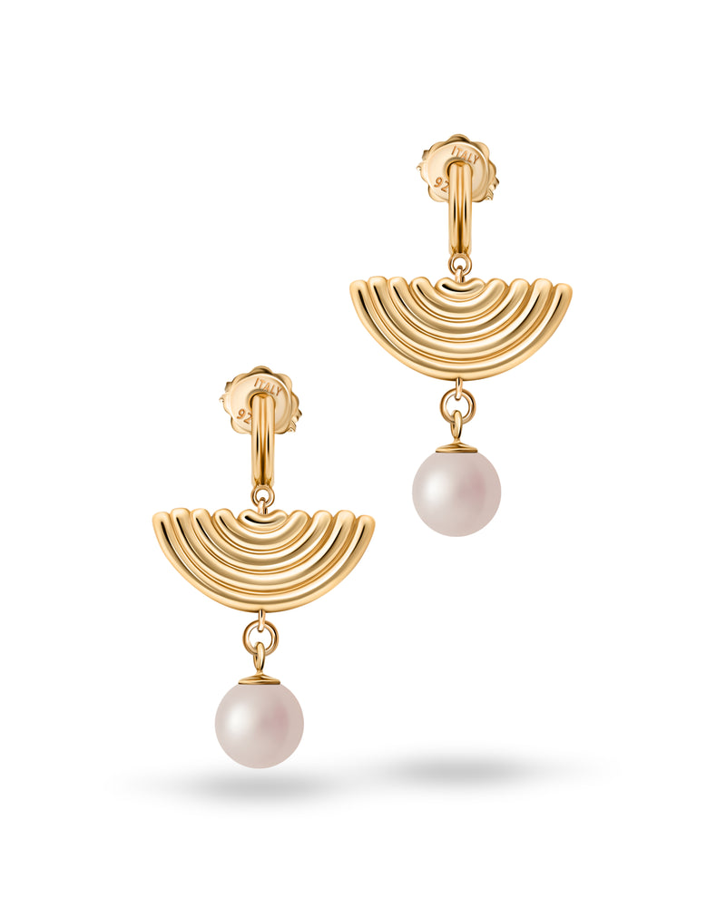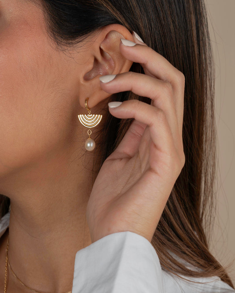 Jeder Ohrring verfügt über eine glänzende, runde Perle, die zart an einem strahlenden goldenen Haken und einer Platte hängt und eine anmutige Silhouette schafft, die jedes Ensemble mühelos aufwertet.