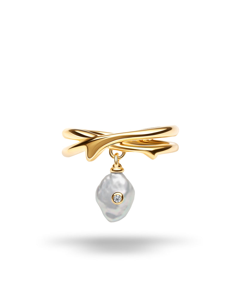 Zarte Stränge aus 925er Silber wölben sich wie Bänder, geschmückt mit einer leuchtenden Perle, die einen funkelnden Diamanten hält, der bei jeder Bewegung das Licht einfängt.