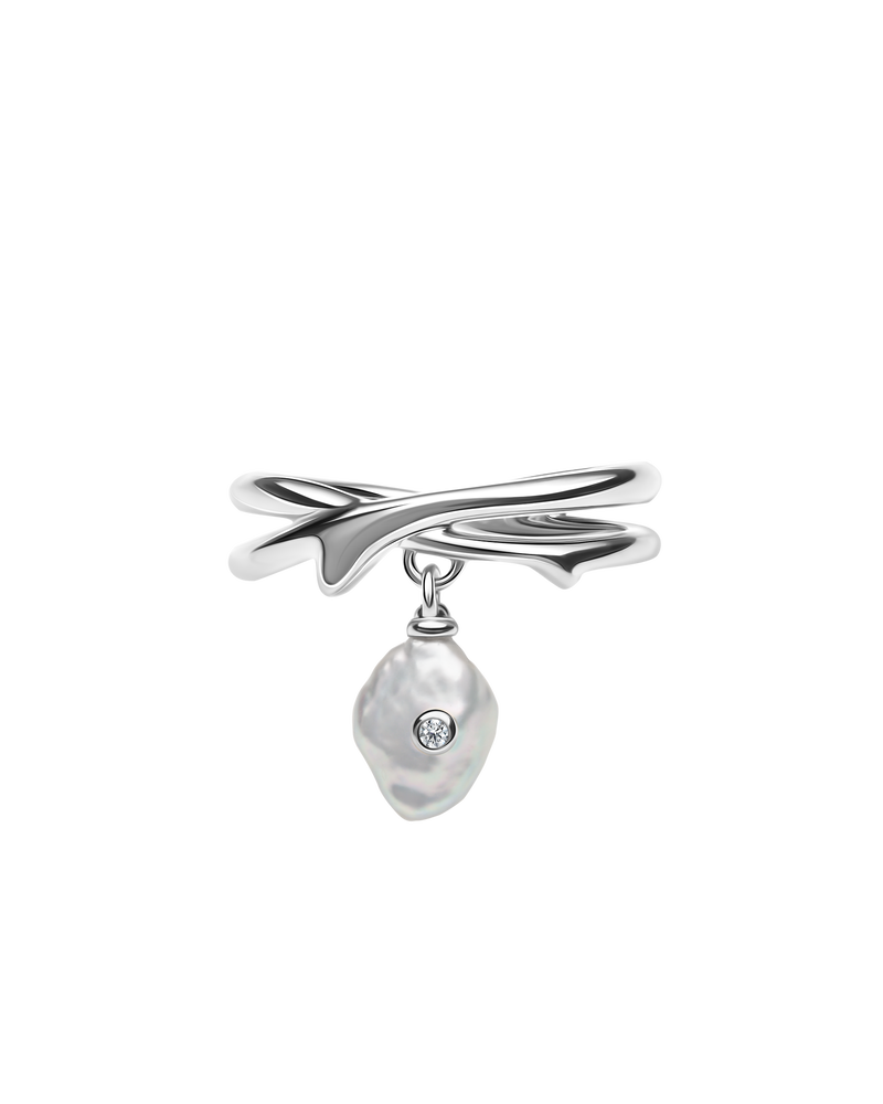 Zarte Stränge aus 925er Silber wölben sich wie Bänder, geschmückt mit einer leuchtenden Perle, die einen funkelnden Diamanten hält, der bei jeder Bewegung das Licht einfängt.