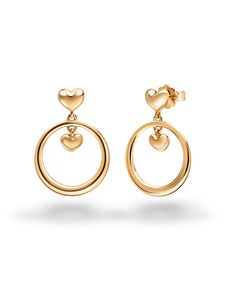 A gold pair of earrings adorned with symbols of love celebrating life’s sweetest surprises. Little hearts dangle from bright circles in a perfectly harmonious design.