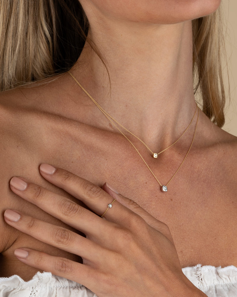 Der Anhänger ist in einer eleganten Fassung an einer Goldkette eingefasst und verleiht einem klassischen Stück eine moderne Note. Er ist ideal für alle, die klare Linien und ein raffiniertes Funkeln schätzen, das jedes Outfit ergänzt.