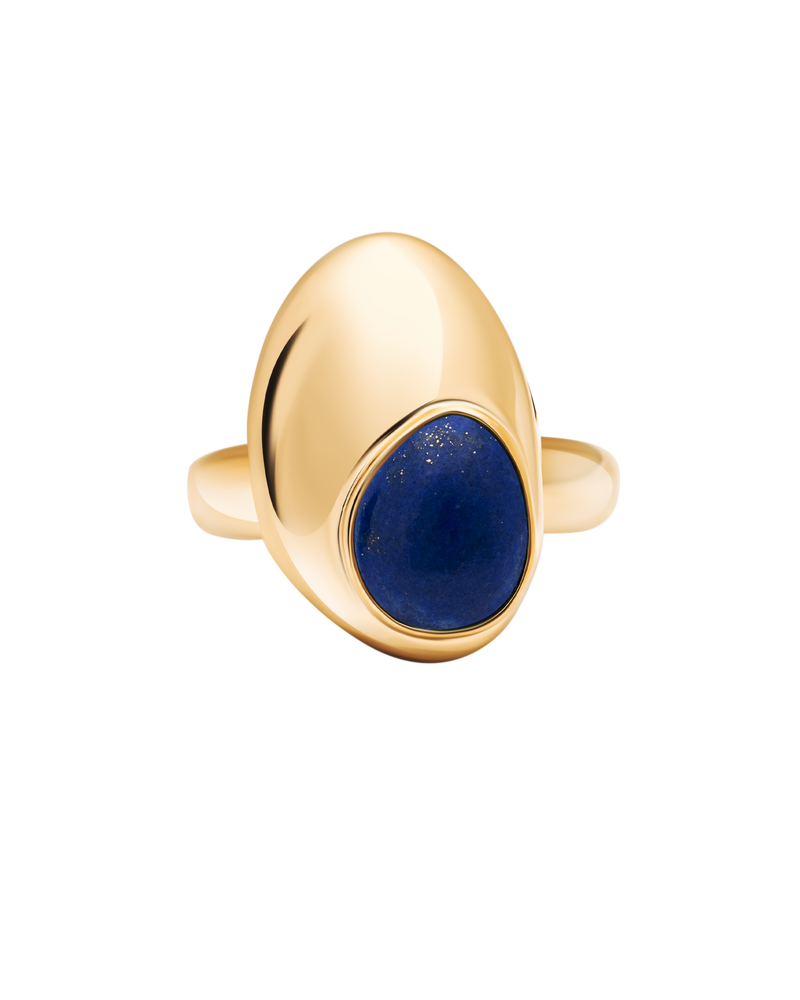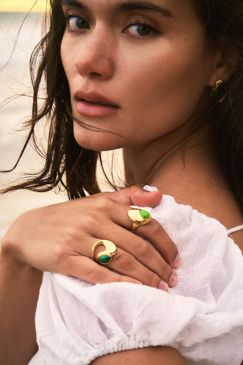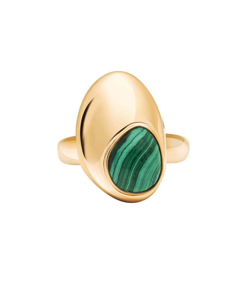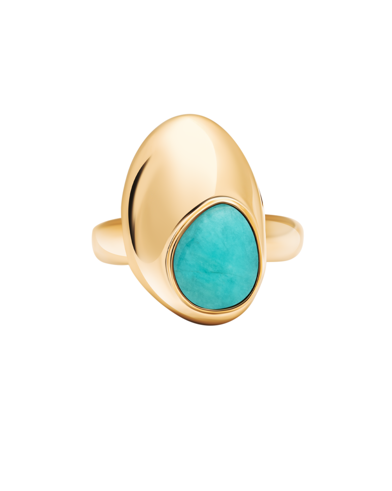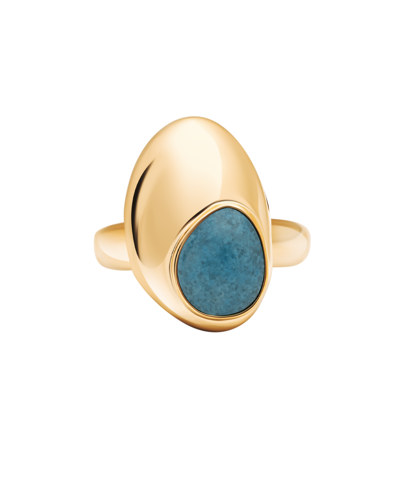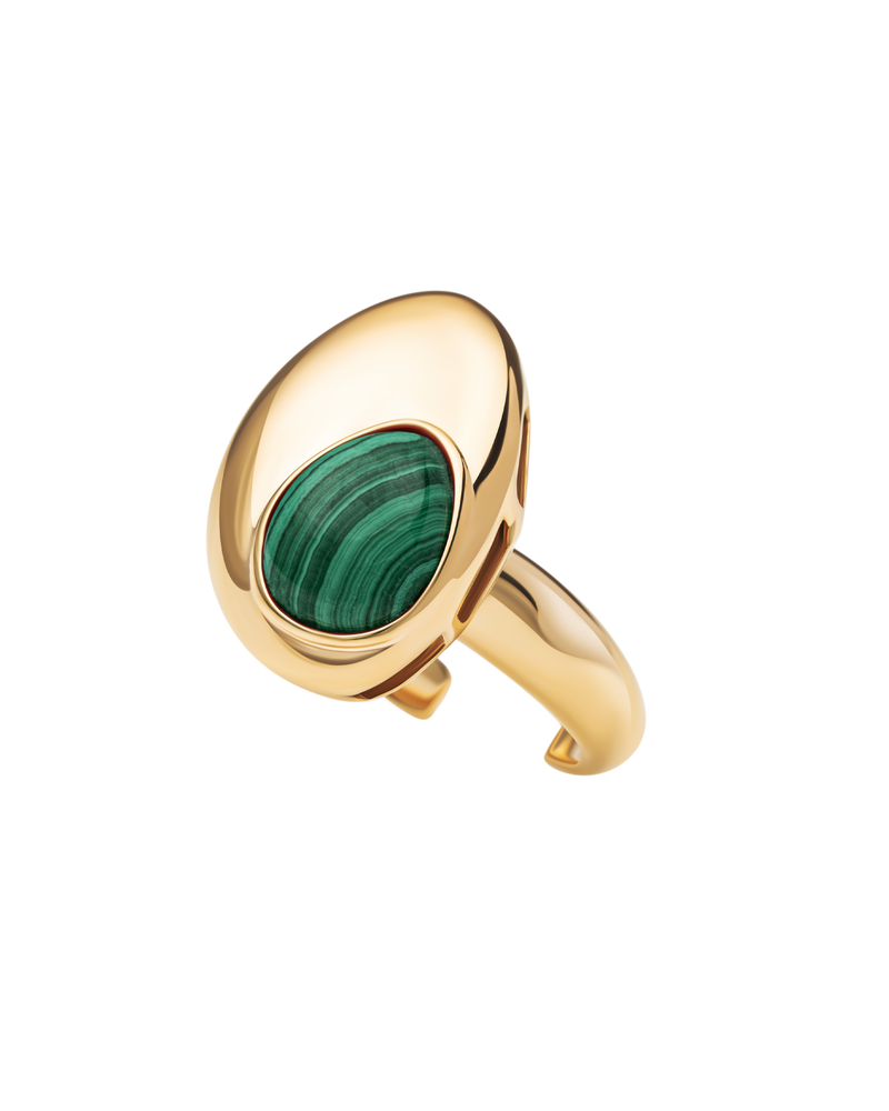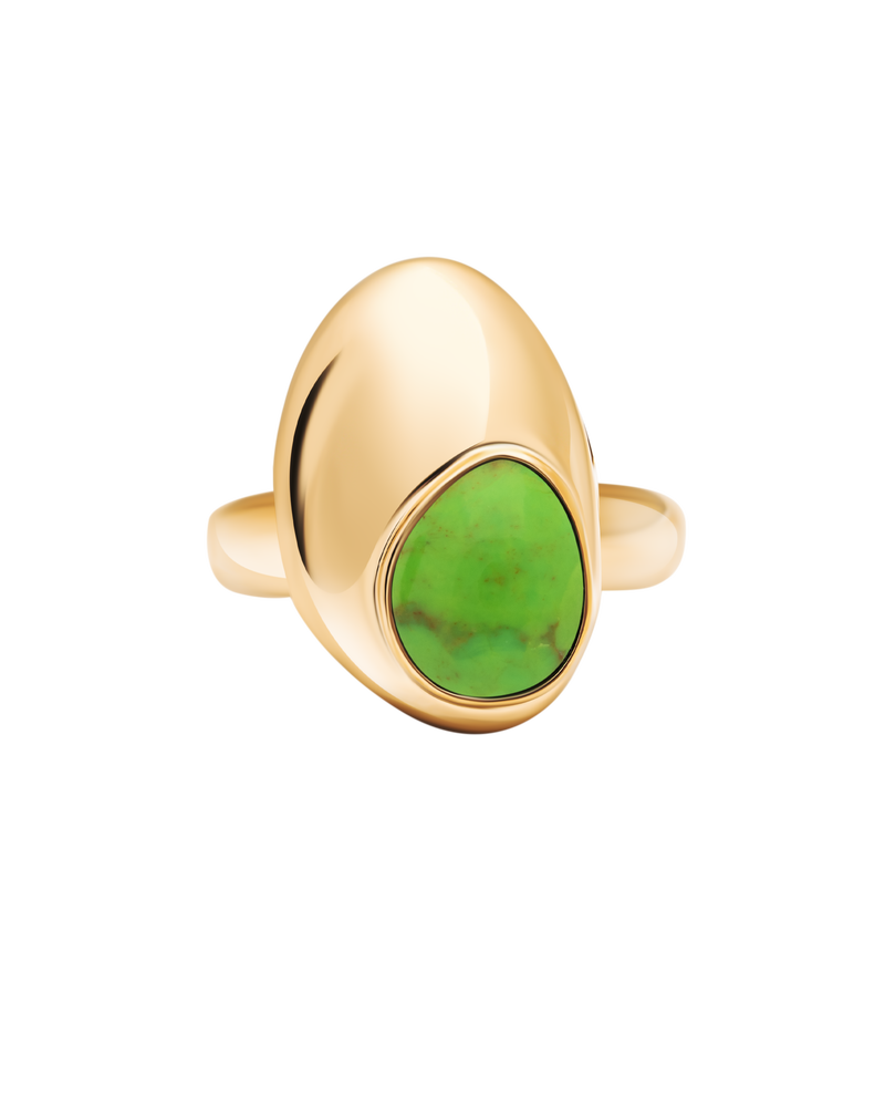 Ein klares Goldband wird durch eine unregelmäßige Form bereichert, die nahtlos mit dem bunten Edelstein verschmilzt. Genau wie ein Tropfen auf einem klaren Wasserspiegel.