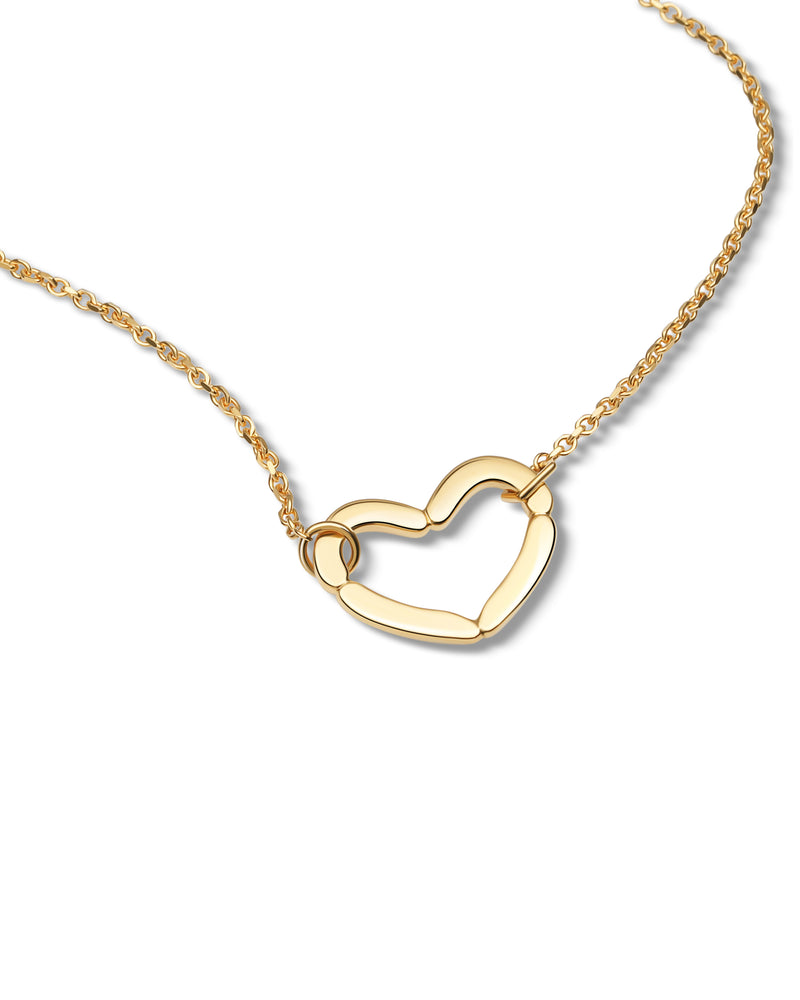 A symbol of enduring love and refined style, our Golden Heart Necklace is crafted with extreme precision creating a radiant canvas that gracefully drapes around your neckline. The centrepiece showcases a simple design with thin plates connected to shape a captivating heart pendant which matches the details of the chain. Whether worn as a symbol of affection or a personal statement of sophistication, this necklace combines classic charm with contemporary allure