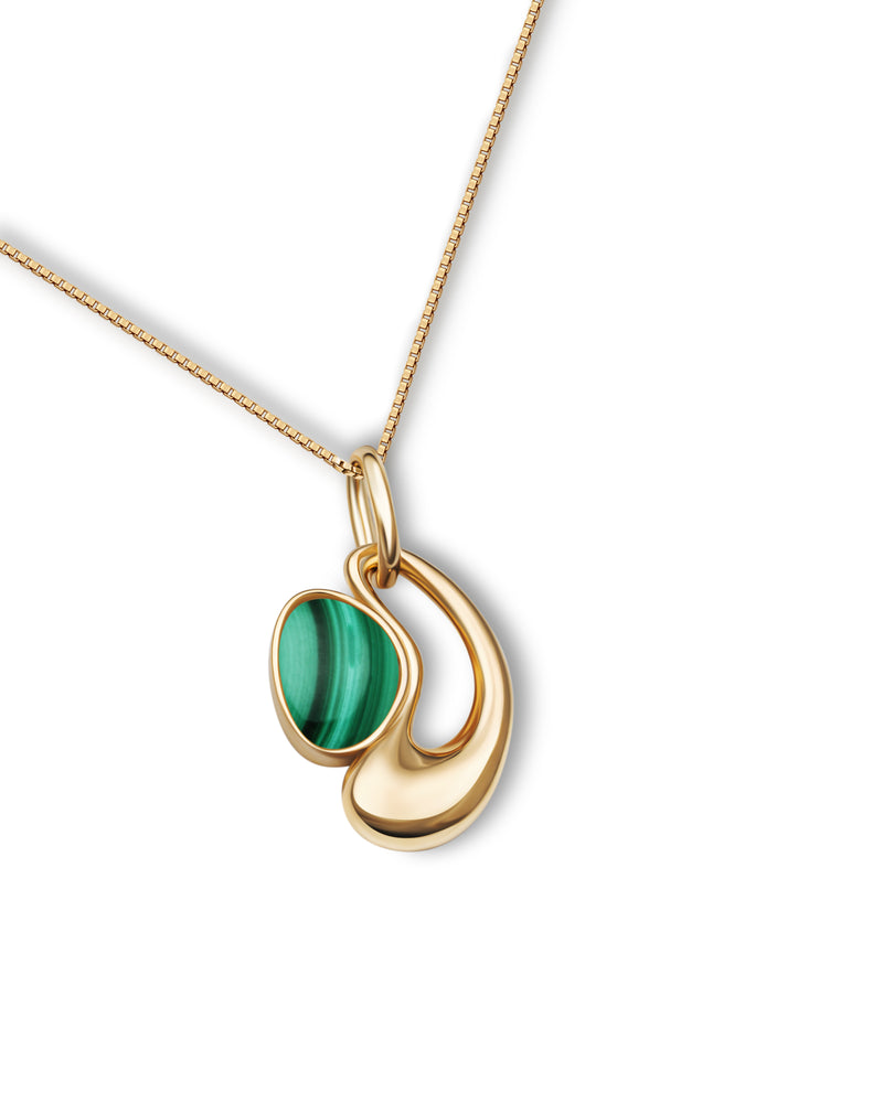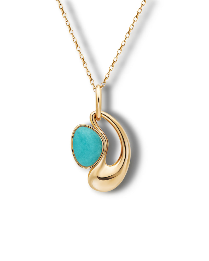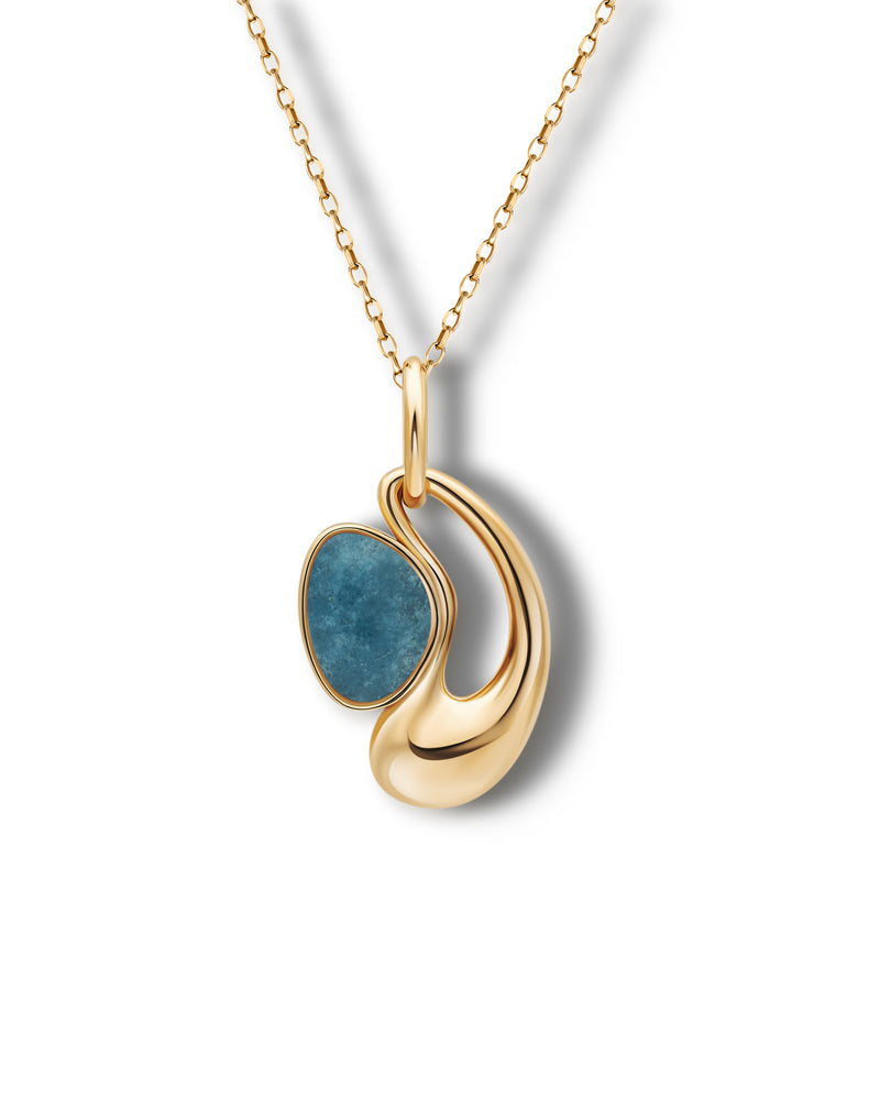 Set in a uniquely crafted, fluid gold-toned metal design, this piece exudes both sophistication and modern elegance. Perfect for any occasion, this pendant is sure to add a touch of timeless charm and a pop of colour to any outfit.
