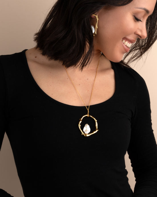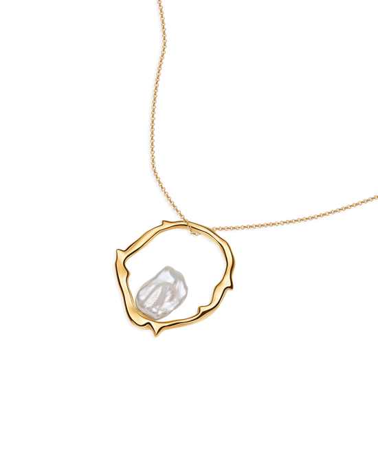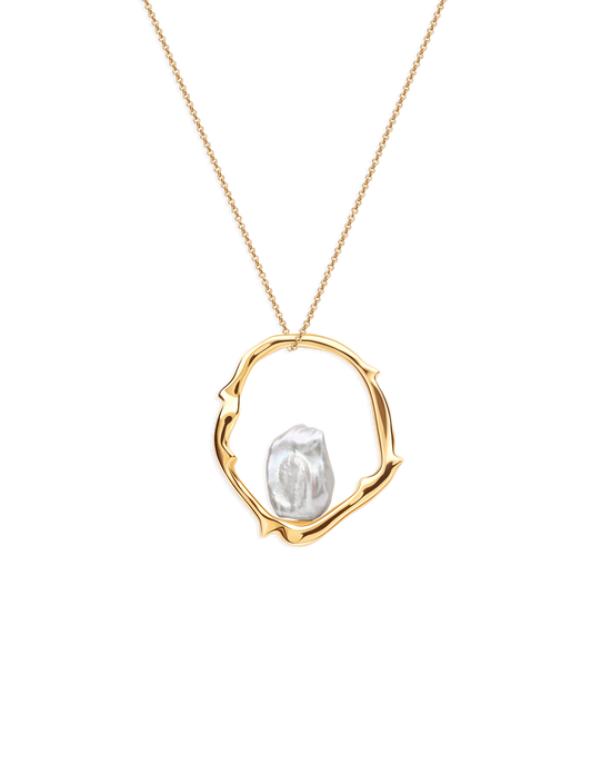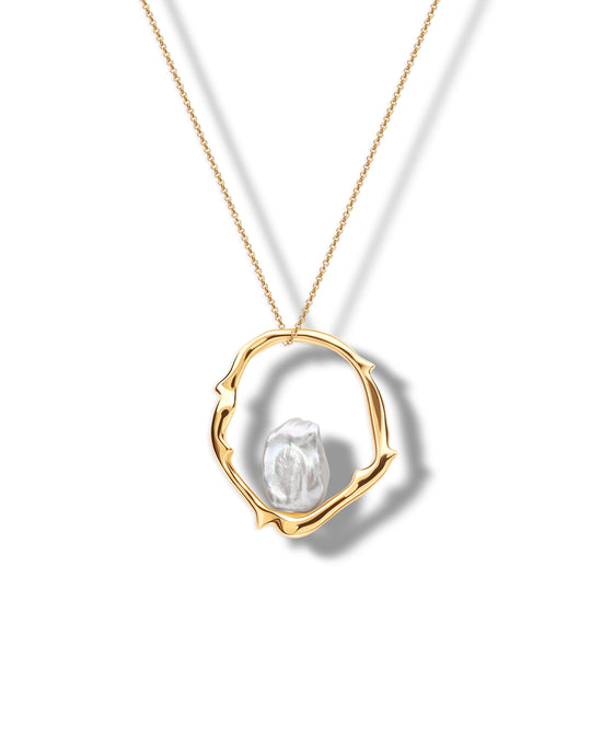A sculptural 3-micron gold-plated silver ring reminiscent of coral branches cradles a glowing pearl, which adds a white accent like sunlight filtering through the water.