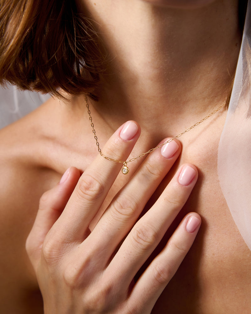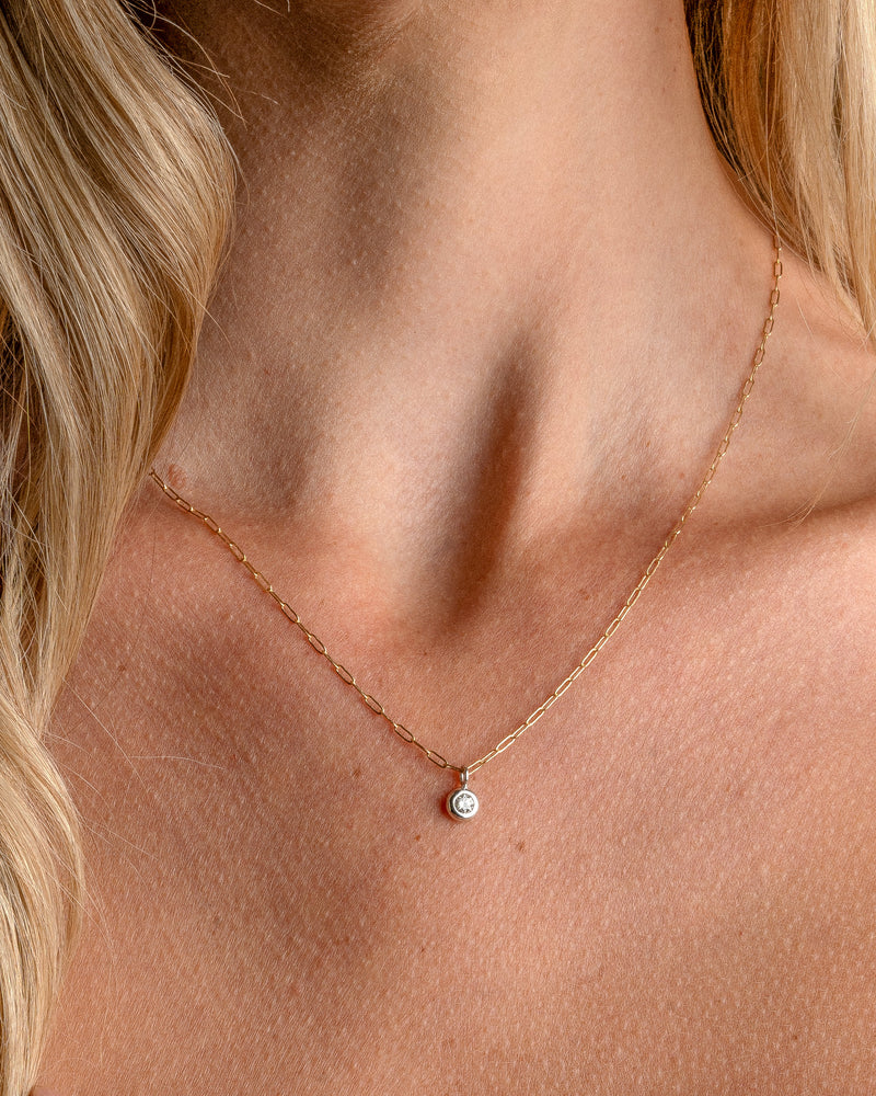 A small but powerful pendant sits on this necklace, held by a chain of squared rings, for a touch of movement. Diamond and gold is the match we all need.