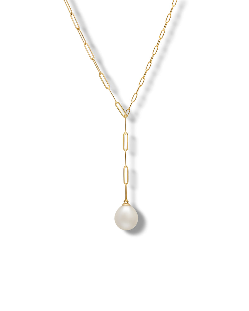 The twist of modernity is given by sleek chain made of suqared gold rings, while the pearl is a reminder of a timeless taste.