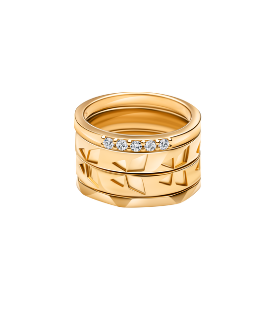 With a variety of textures, finishes, and designs, this stack offers a range of options for you to mix and match to create your own unique style. Each ring is crafted from high-quality materials, ensuring durability and long-lasting beauty. A piece of jewellery that makes of diamonds, engravings and gold the mean to make a personalised statement.